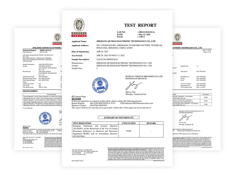 Nuestra empresa ha superado las pruebas de contacto con alimentos para detectar BPA, de acuerdo con los requisitos de la Unión Europea, Alemania, Francia e Italia. También hemos superado las pruebas de la FDA de EE. UU., la RoHS de la UE y la RACH.