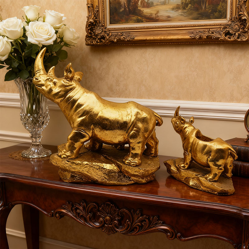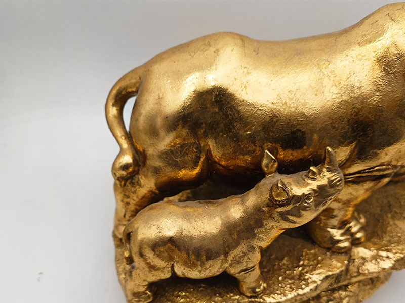 The main part is made of resin, a highly malleable material that can precisely shape the strong muscle lines, rough skin texture and sharpness of the rhinoceros horn of the rhinoceros. Ancient gold: It has an aged effect,