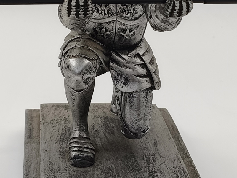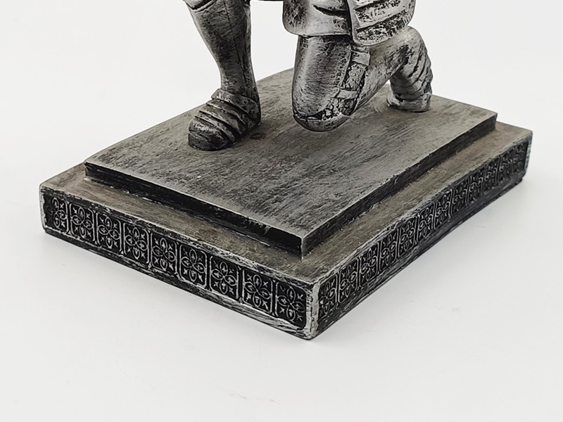 Está hecha de resina. El proceso de envejecimiento plateado mate le da a la armadura una textura nítida y tridimensional. La base, grabada con motivos retro, es gruesa y estable, lo que dificulta su vuelco al colocarla. La superficie está recubierta con un acabado resistente al desgaste que no se decolora fácilmente.