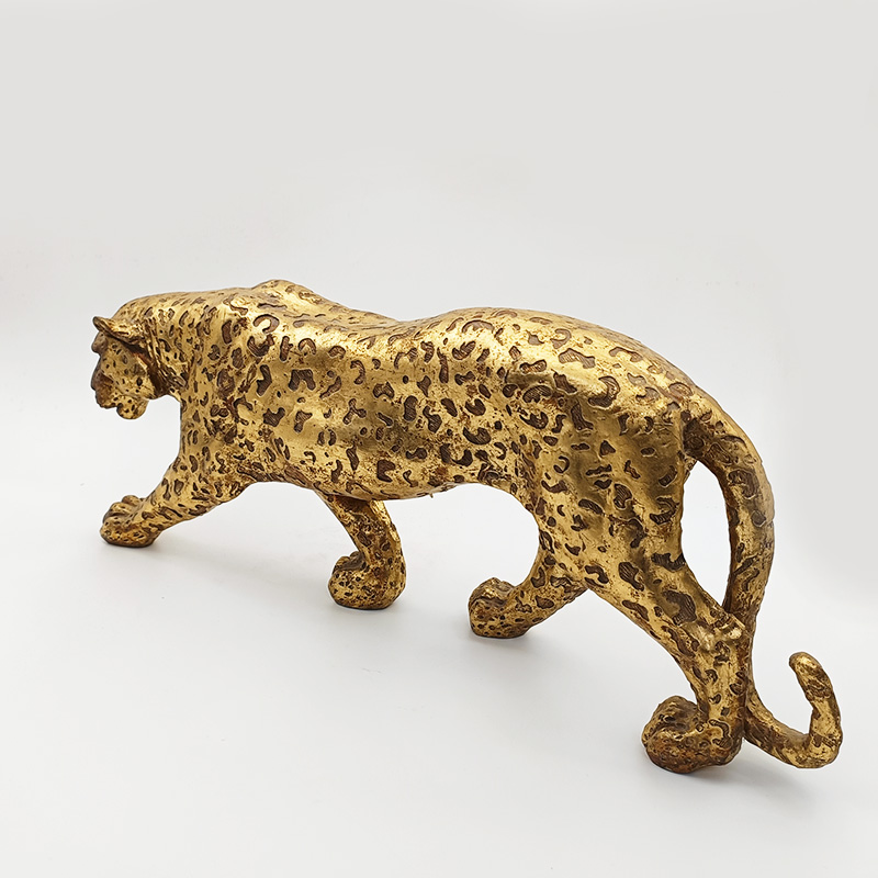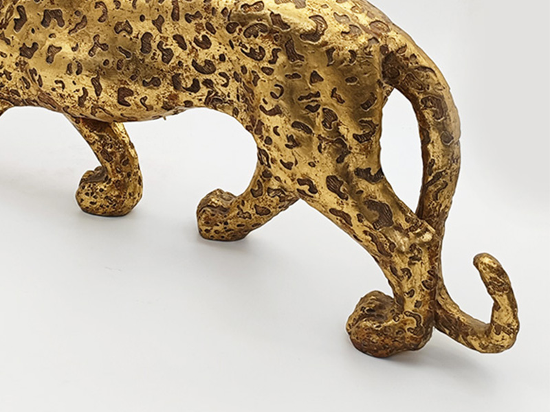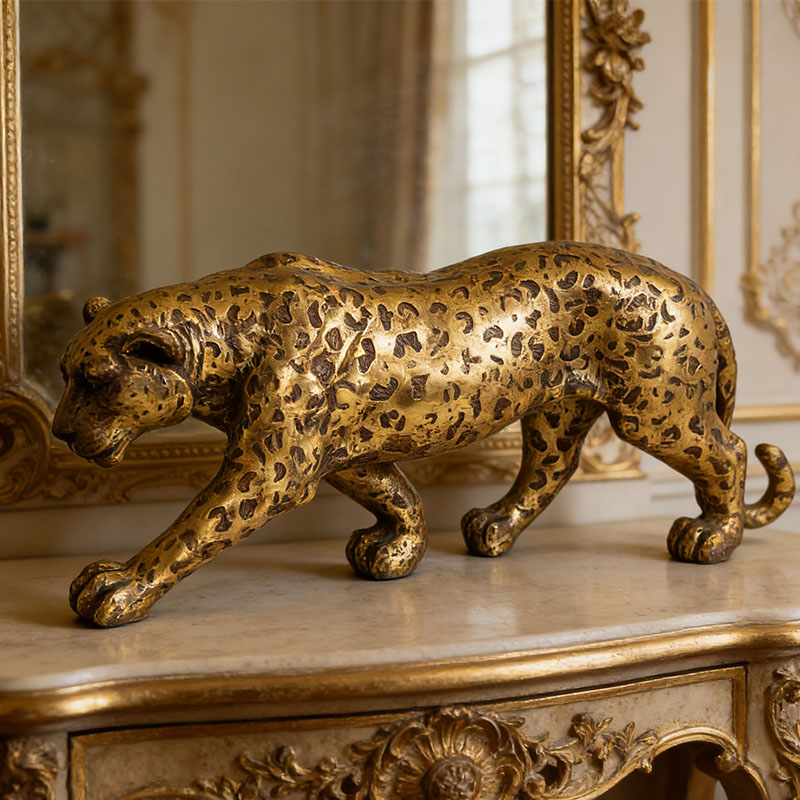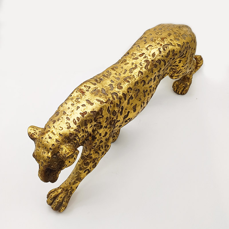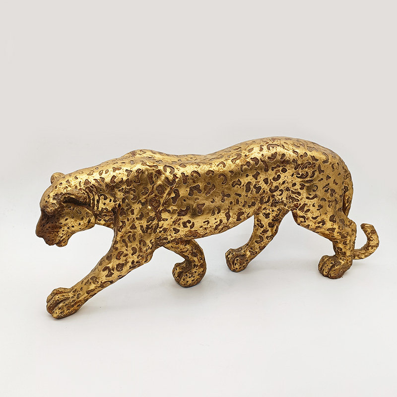 Esta figura de guepardo dorada está meticulosamente elaborada con técnicas realistas, representando la postura dinámica del guepardo al caminar a cuatro patas. La superficie está cubierta con texturas doradas moteadas, y el acabado dorado mate se combina con una textura metálica esmerilada, recreando el encanto retro del dorado de imitación cobre. La figura reproduce con precisión el cuerpo estilizado y las extremidades estiradas del guepardo, con una cabeza baja y curvada y una postura serena, complementada con rasgos detallados, detalles de garras y capas distintivas de la textura de la piel de leopardo. Los patrones irregulares de la piel de leopardo en el cuerpo están claramente definidos, y el tallado realista de las líneas musculares le da a la figura una sensación de poder.