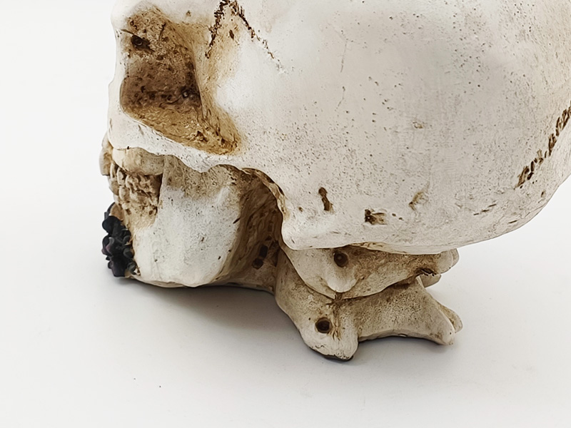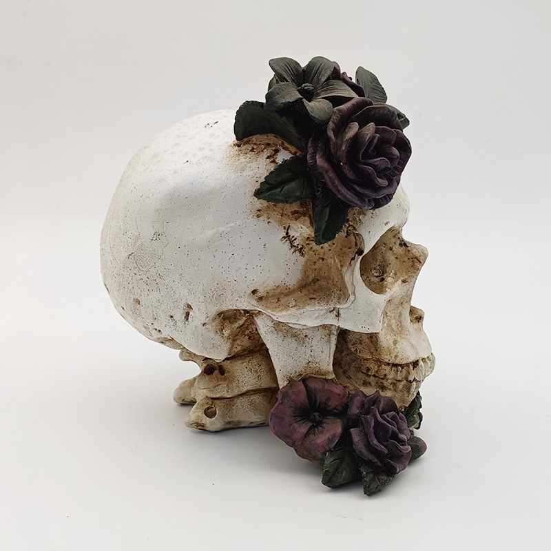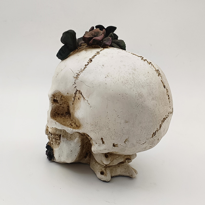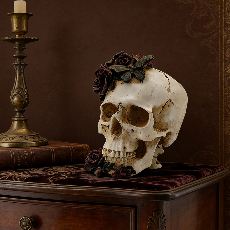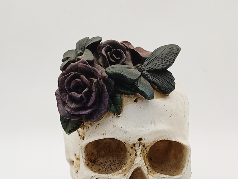 Coloración básica: El cuerpo principal del esqueleto está recubierto con 2 o 3 capas finas de pintura blanca mate. Tras el secado, se envejece y se tiñe con pigmentos oscuros para realzar la textura de las ranuras óseas. Las rosas se colorean en capas (color base morado oscuro + degradado rosa oscuro), las hojas se pintan de verde oscuro y la mariposa se pinta en blanco y negro o en contraste morado oscuro, todo con líneas finas que delinean los patrones detallados.