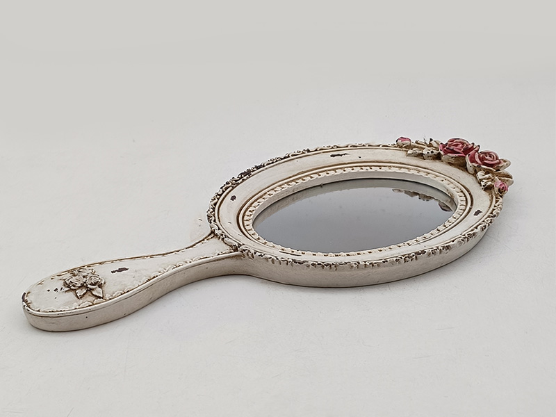 Material y artesanía: El cuerpo principal del espejo está hecho de resina. La superficie está recubierta con un acabado blanco envejecido y los bordes presentan un efecto biselado marrón claro, creando una textura retro y moteada.