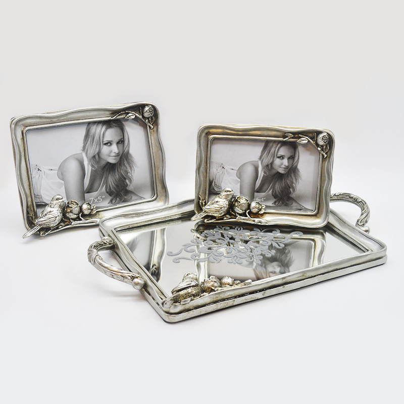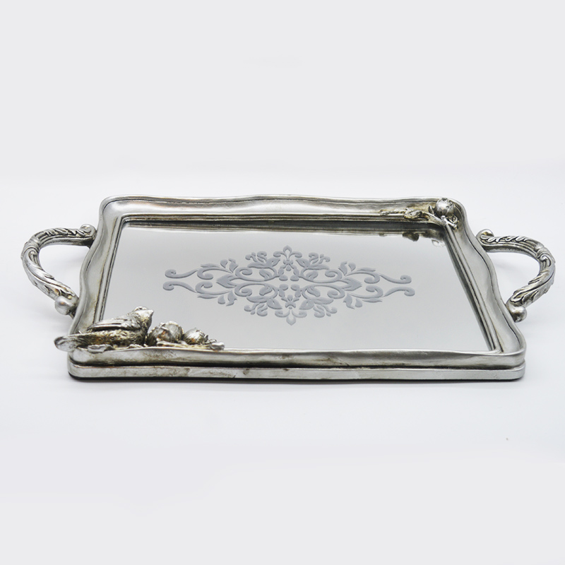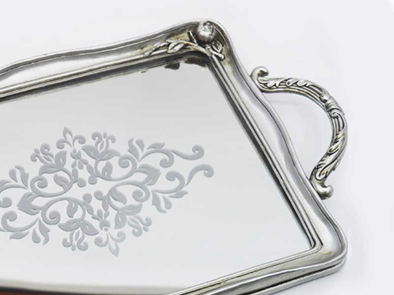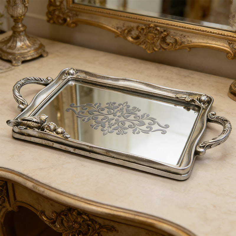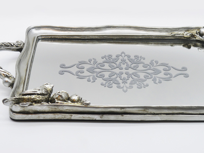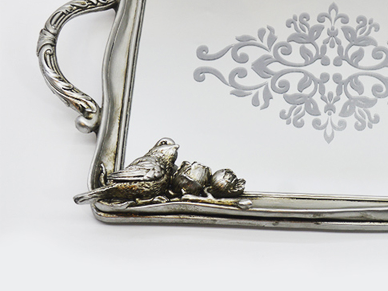 El marco principal está hecho de material de resina, con un tratamiento de enchapado en plata envejecida retro en la superficie, presentando una textura metálica mate; el núcleo interior de la bandeja es de vidrio de espejo de alta definición de 3 mm de espesor, que combina características tanto decorativas como prácticas.